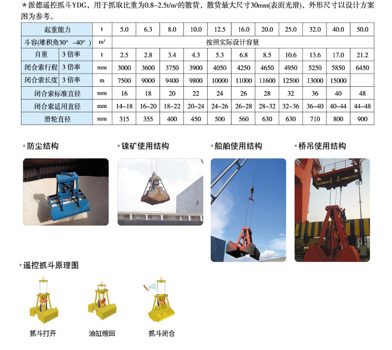 遙控抓斗是一種配合單索起重機通過無線遙控發(fā)射器來控制打開的新穎抓斗。它不需要外界能源,在料堆上能隨吊鉤的起升自動閉合,又能在空中任意位置自動打開并可以隨時停止。抓斗內(nèi)部有蓄電瓶,通過控制電磁閥的開閉來控制抓斗的打開。抓斗不需要其它任何電源,綠色環(huán)保。該抓斗作為一種機電一體化的新發(fā)明而深受用戶的歡迎。它的誕生改寫了起重運輸行業(yè)中單索抓斗效率低下的歷史。遙控抓斗一般由上承梁總成、滑移座總成、下承梁總成、斗體、撐桿以及油缸幾大部件組成。其中上承梁總成和滑移座總成中有與起重機相連的滑輪組,油缸的筒體及活塞桿分別與下承梁總成及滑移座總成聯(lián)接?;谱梢栽谄鹬貦C作用下上下滑動,帶動下承梁一起起升,從而帶動抓斗閉合;通過遙控器控制下承梁和滑移座的脫開,從而控制抓斗的打開。